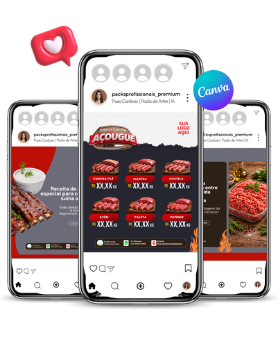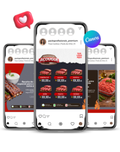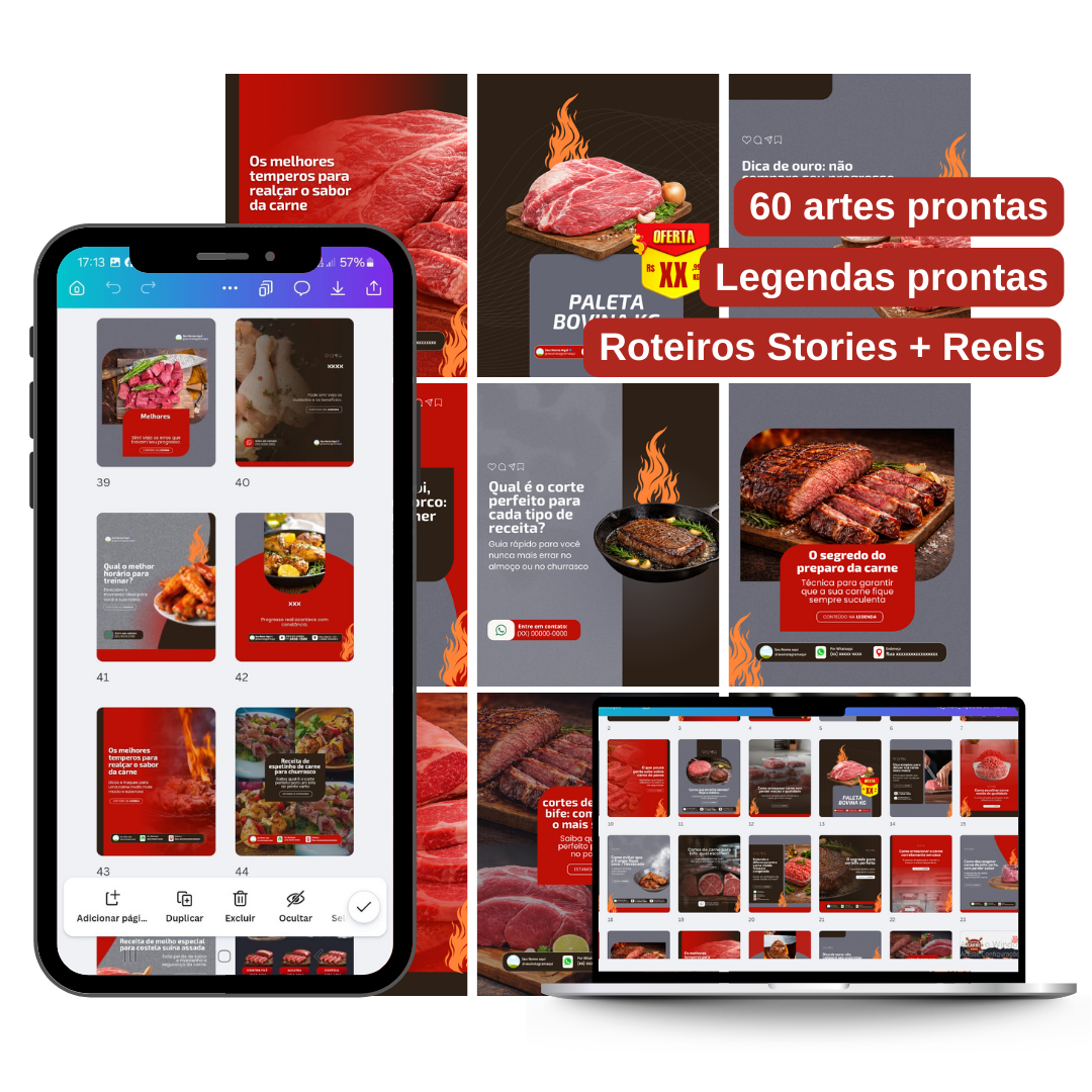 Todas as artes são editáveis no Canva (gratuito ou Pro). Altere textos, cores e detalhes para combinar com o seu açougue